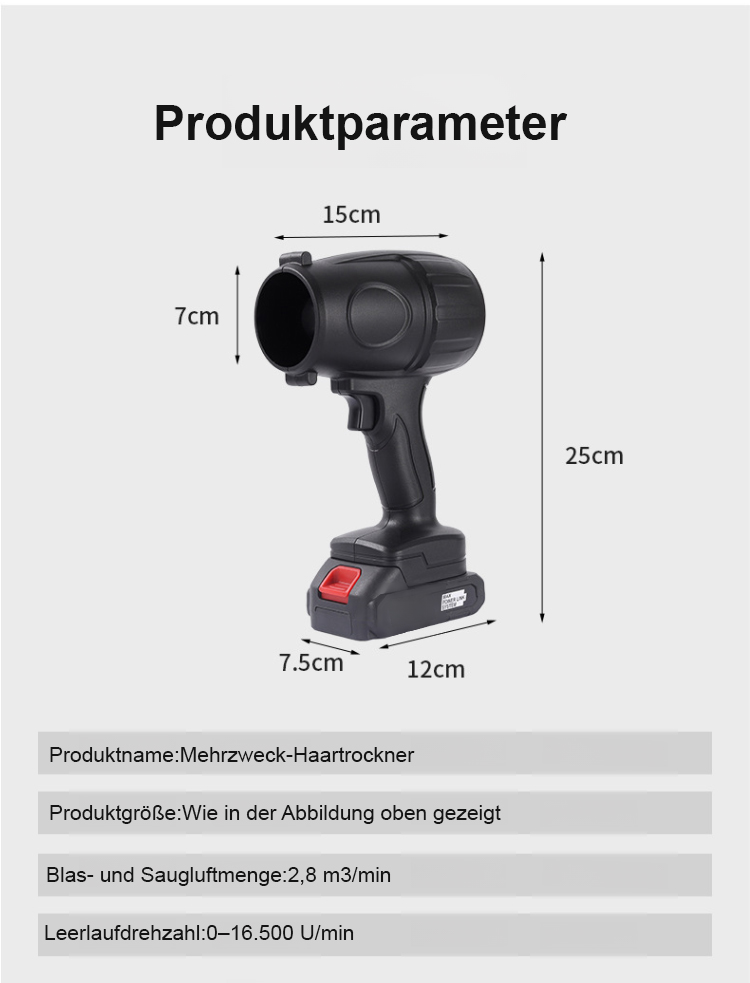 Bestellen Sie noch heute und sichern Sie sich für kurze Zeit 50 % Rabatt! Die ersten 50 Bestellungen erhalten außerdem ein kostenloses Düsenset! Wir versprechen: Expressversand innerhalb von 48 Stunden und 14 Tage kostenlose Testphase – nicht zufrieden mit dem Ergebnis? Zu wenig Luftstrom? Volle Rückerstattung garantiert!