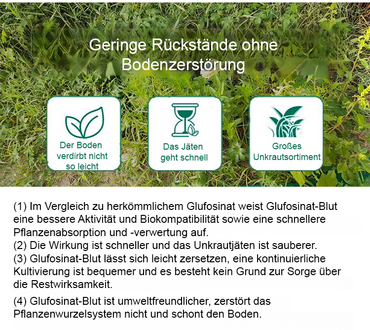 99% Unkrautbekämpfungsrate; Unkraut verwelkt in drei Stunden; fünf Jahre lang wächst kein Unkraut mehr.